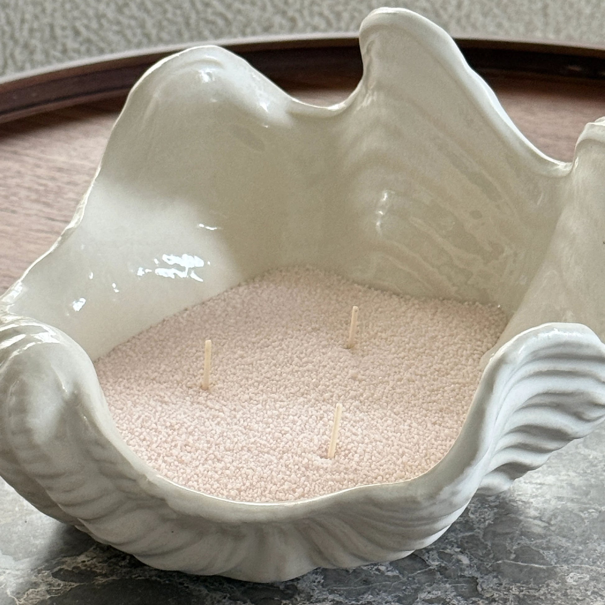 Kreminės spalvos kvepiantys žvakių perlai.